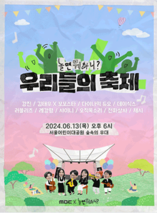 6월 초여름의 싱그러운이 가득한 달에 MBC 놀면 뭐 하니 프로그램에서 주체하는 대규모 축제가 펼쳐집니다. 6월 13일 모두가 기다리고 있던 놀면 뭐 하니 우리들의 축제가 서울어린이대공원에서 열립니다. 유재석을 비롯한 많은 스타들이 참여하는 이번 행사에 참석하셨서 공연의 아름다움과 감동을 느껴보시기 바랍니다.